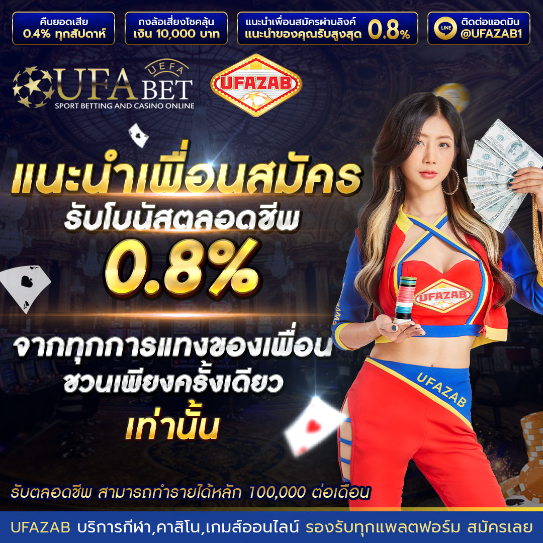 UFAZAB: เว็บพนันออนไลน์ครบวงจร ให้บริการเกมพนันหลากหลายรูปแบบ ทั้งกีฬา คาสิโน สล็อต และหวย ด้วยระบบฝาก-ถอนอัตโนมัติรวดเร็วภายใน 30 วินาที รองรับการเล่นผ่านมือถือทุกระบบ มีทีมงานดูแล 24 ชั่วโมง เว็บไซต์มีความปลอดภัยสูง ใช้เทคโนโลยีเข้ารหัส SSL ป้องกันข้อมูล มีโปรโมชั่นสำหรับสมาชิกใหม่และเก่า เช่น โบนัสแรกเข้า 100% เครดิตฟรี และคืนยอดเสีย สมัครสมาชิกง่ายผ่านระบบอัตโนมัติ ไม่มีขั้นต่ำ เริ่มเดิมพันเพียง 1 บาท ระบบเว็บรองรับภาษาไทย ใช้งานสะดวก มีคู่มือแนะนำวิธีเล่นเกมต่างๆ อย่างละเอียด เป็นเว็บตรงไม่ผ่านเอเย่นต์ มีความมั่นคงทางการเงินสูง จ่ายจริงทุกยอดเดิมพัน